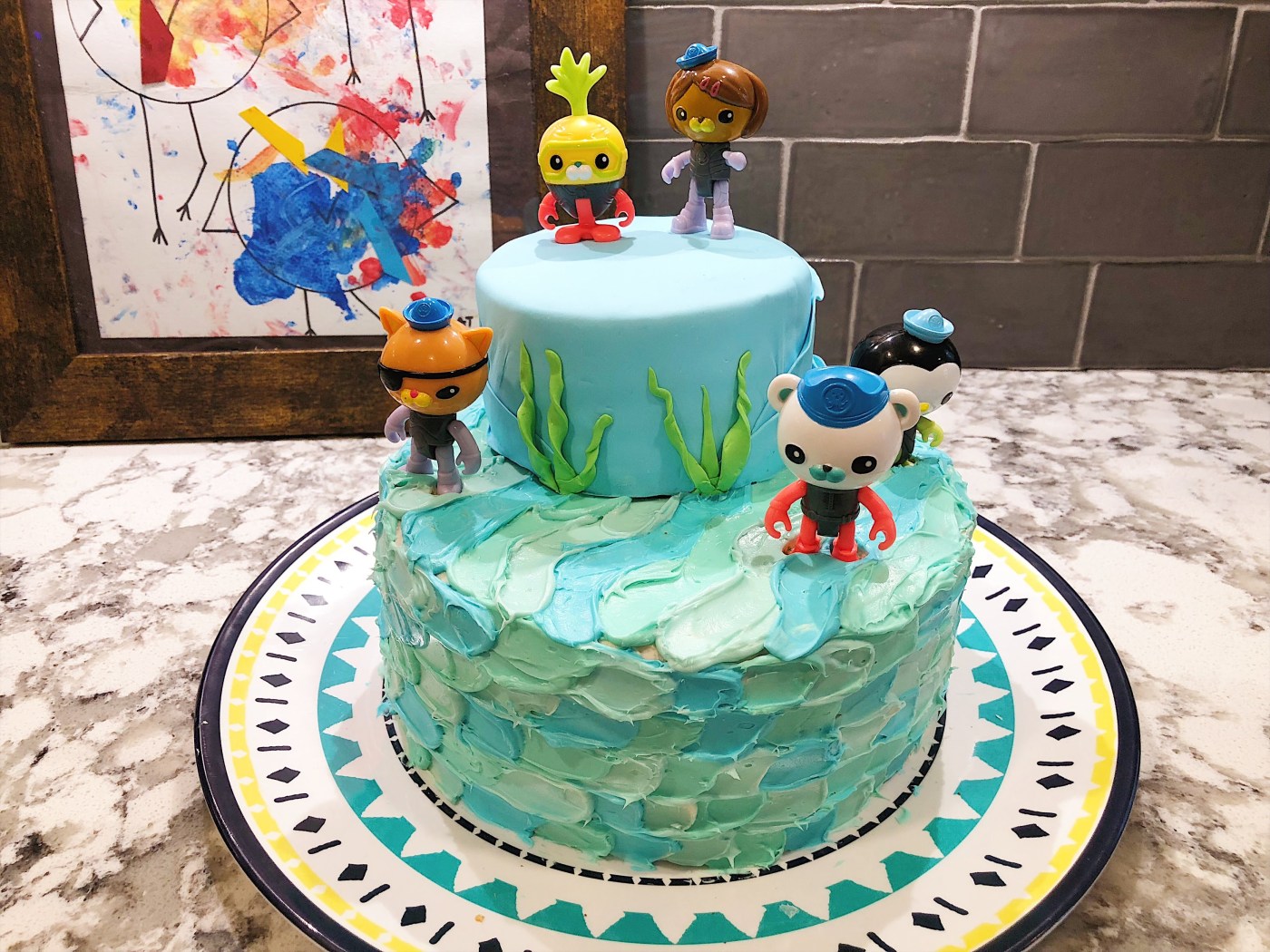 I tried to do a little bit the morning of, keeping it simple but fun. Cray paper twisted at different heights on the wall were seaweed and I cut out a few fish I drew from stock paper that the kids stuck around the house where they wanted to put them. The kids and I also made jellyfish from lanterns (found at the Dollar store for $1!) and cray paper glued to the bottom of the lantern. I didn’t get a picture of it, but we also put fish nets on the ceiling which we filled with balloons for an “under the sea” vibe.